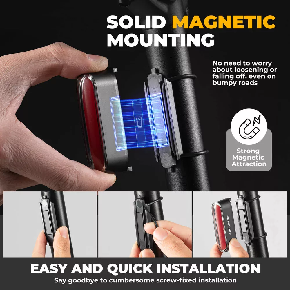 • Magnetische en stabiele bevestiging: Het ROCKBROS achterlicht maakt gebruik van een magnetische bevestiging, dus gereedschap is niet nodig. De sterke magneet zorgt voor een stevige grip, zelfs op oneffen terrein.