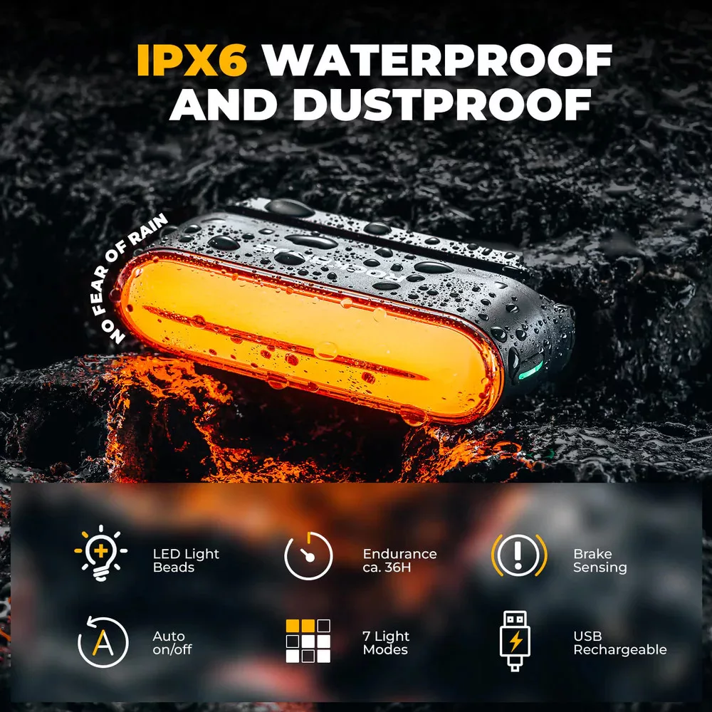 • 7 verlichtingsmodi: Enkel, Dubbel, Snel, Druppelend, Ademend, Wisselend, Constant. Eenvoudig te wisselen voor verschillende situaties en betere zichtbaarheid.