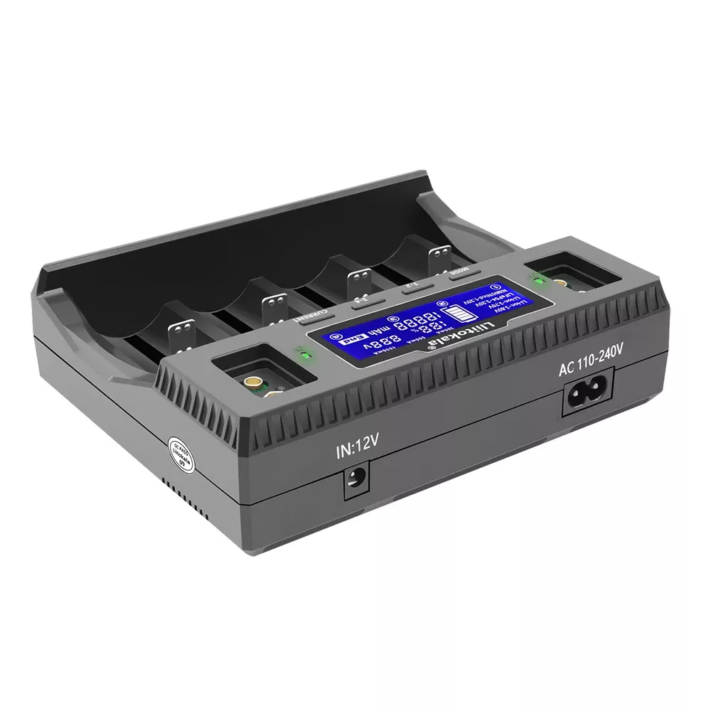 Vierslots LCD-batterijoplader voor zowel Ni-MH als Li-ion batterijen, geschikt voor opladen van maximaal 4 stuks 32700-batterijen.