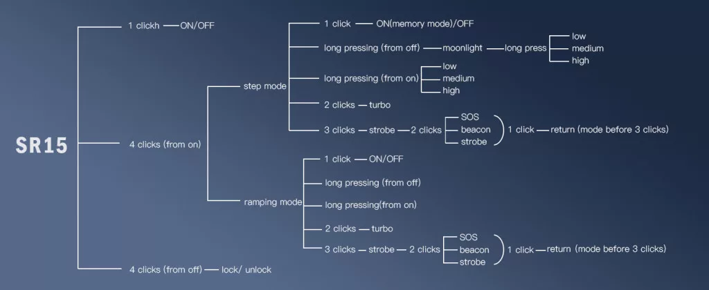 • Ingedrukt houden: Maanlichtmodus. Bij STEPPED (stapsgewijze) lichtregeling start ingedrukt houden de stapsgewijze modi (laag–middel–hoog).