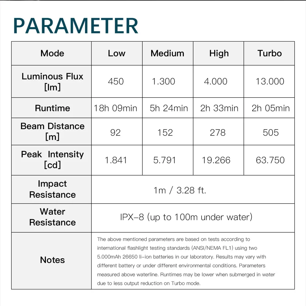• Werkt op 2 stuks 26650 onbeschermde button-top accu's (meegeleverd)